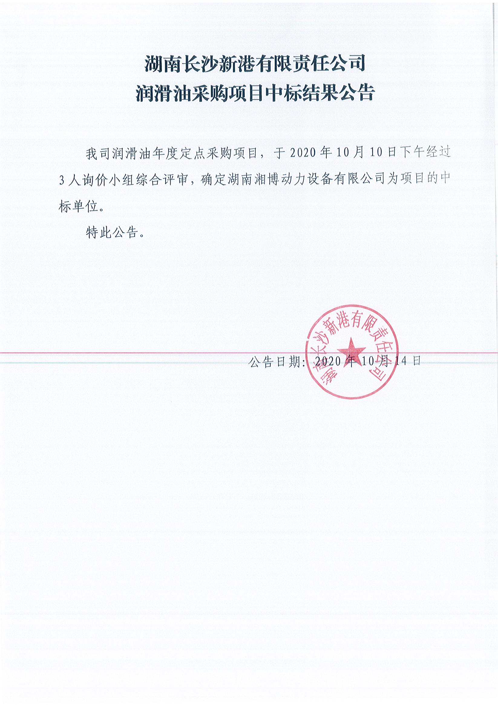 湖南長沙新港有限責(zé)任公司潤滑油采購項目中標(biāo)結(jié)果公告