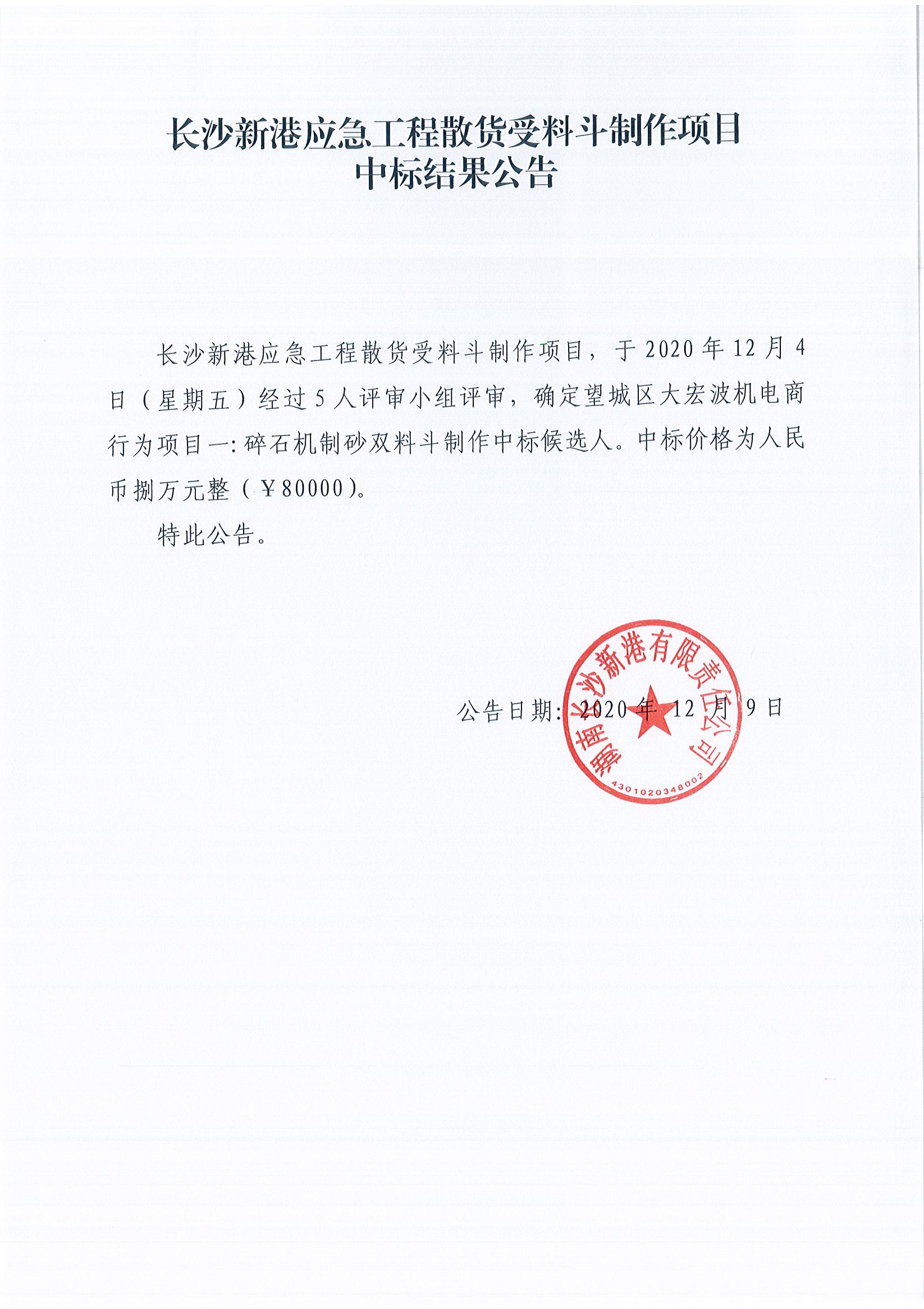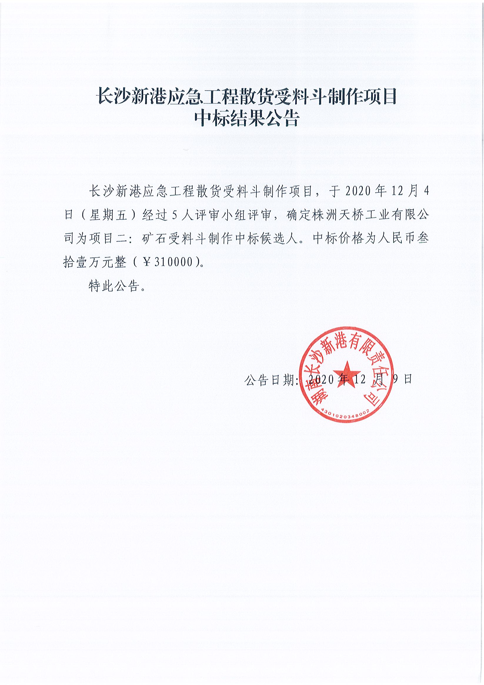 長沙新港應急工程散貨受料斗制作項目中標結果公告