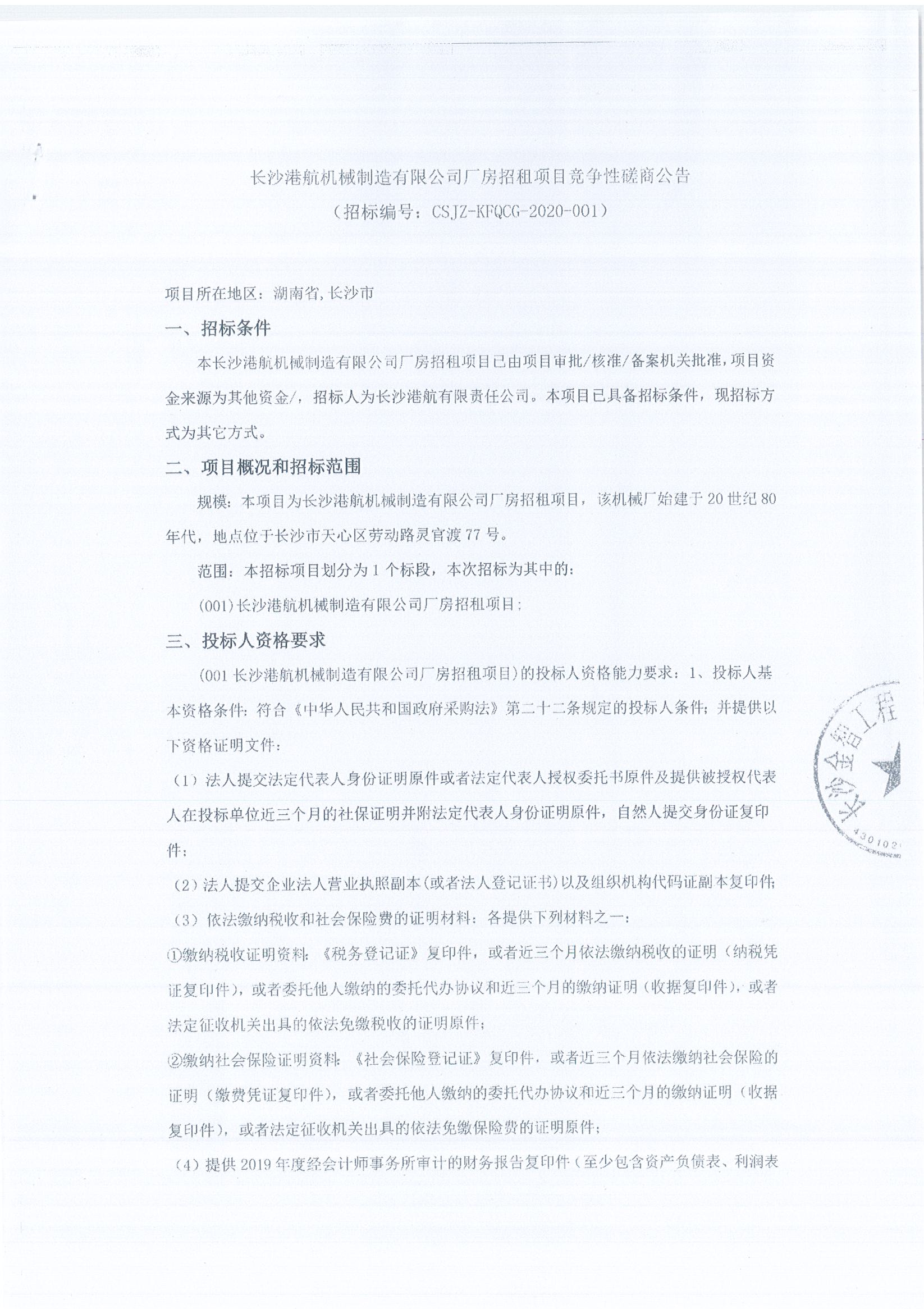長沙港航機械制造有限公司廠房招租項目競爭性磋商公告