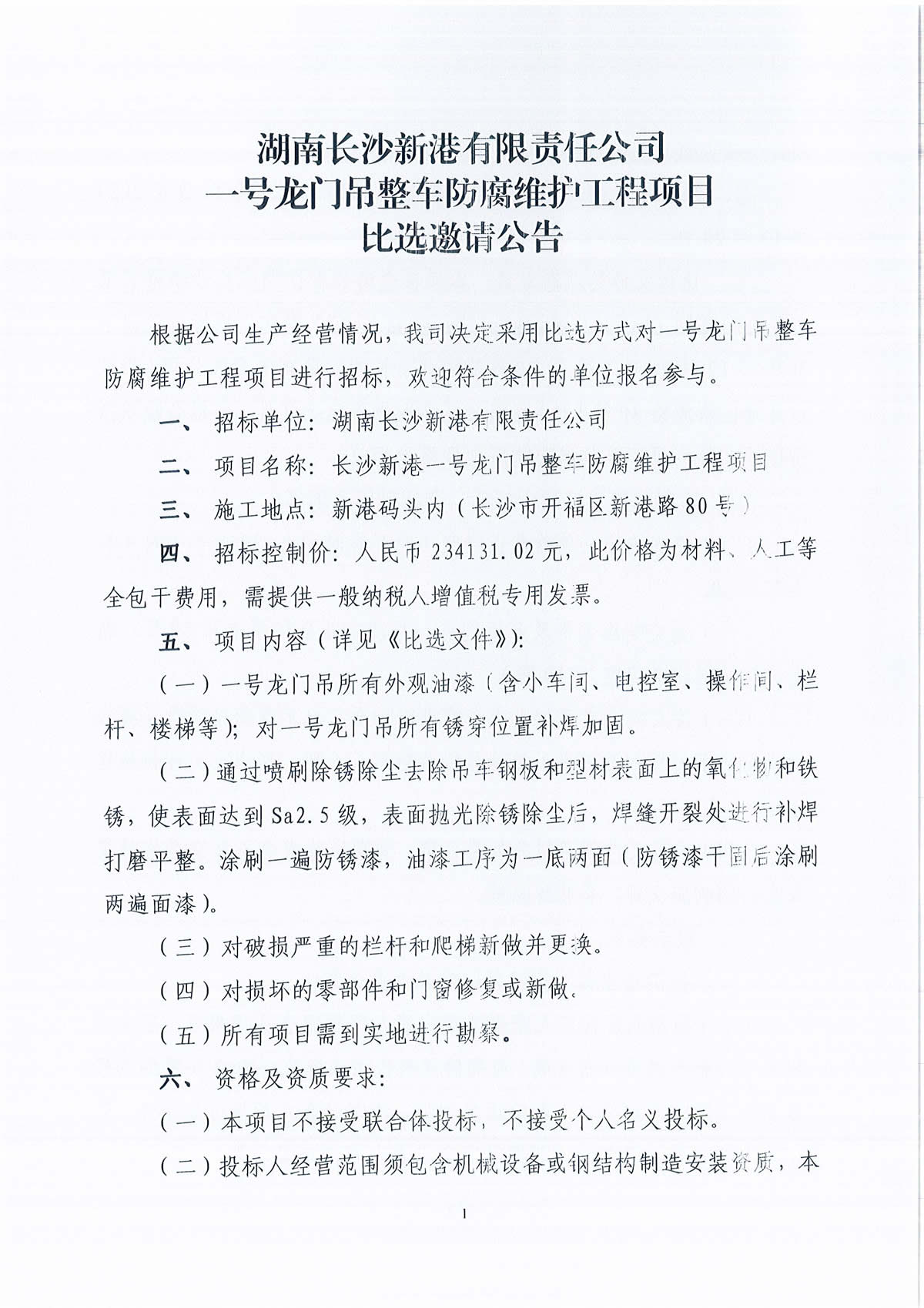 湖南長沙新港有限責(zé)任公司一號(hào)龍門吊整車防腐維護(hù)工程項(xiàng)目比選邀請(qǐng)公告