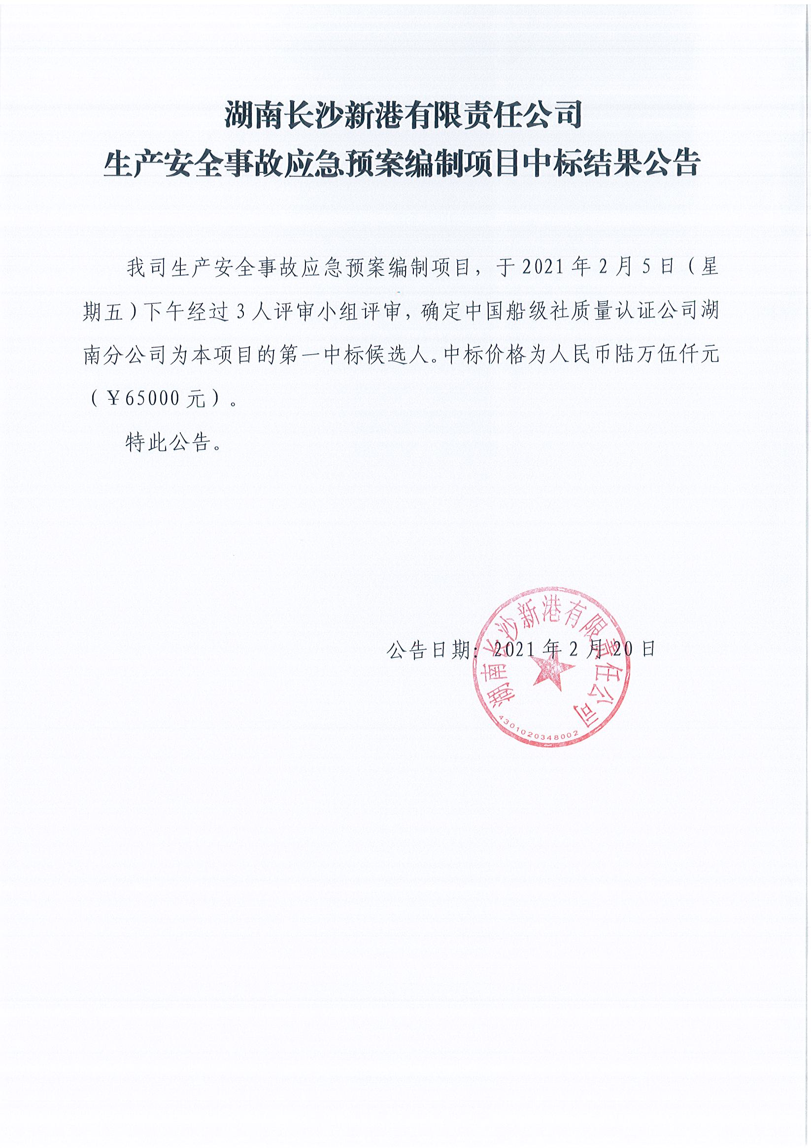 湖南長沙新港有限責任公司生產(chǎn)安全事故應(yīng)急預(yù)案編制項目中標結(jié)果公告