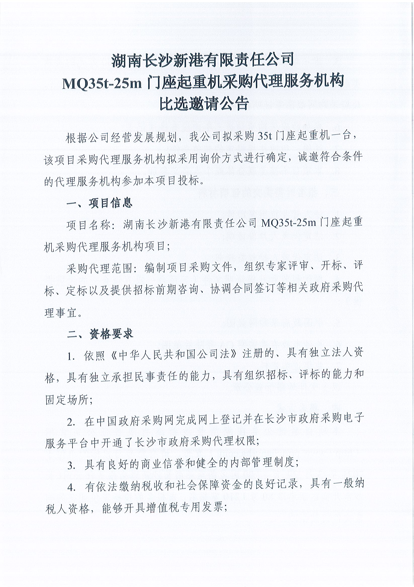 湖南長沙新港有限責(zé)任公司MQ35t—25m門座起重機(jī)采購代理服務(wù)機(jī)構(gòu)比選邀請公告
