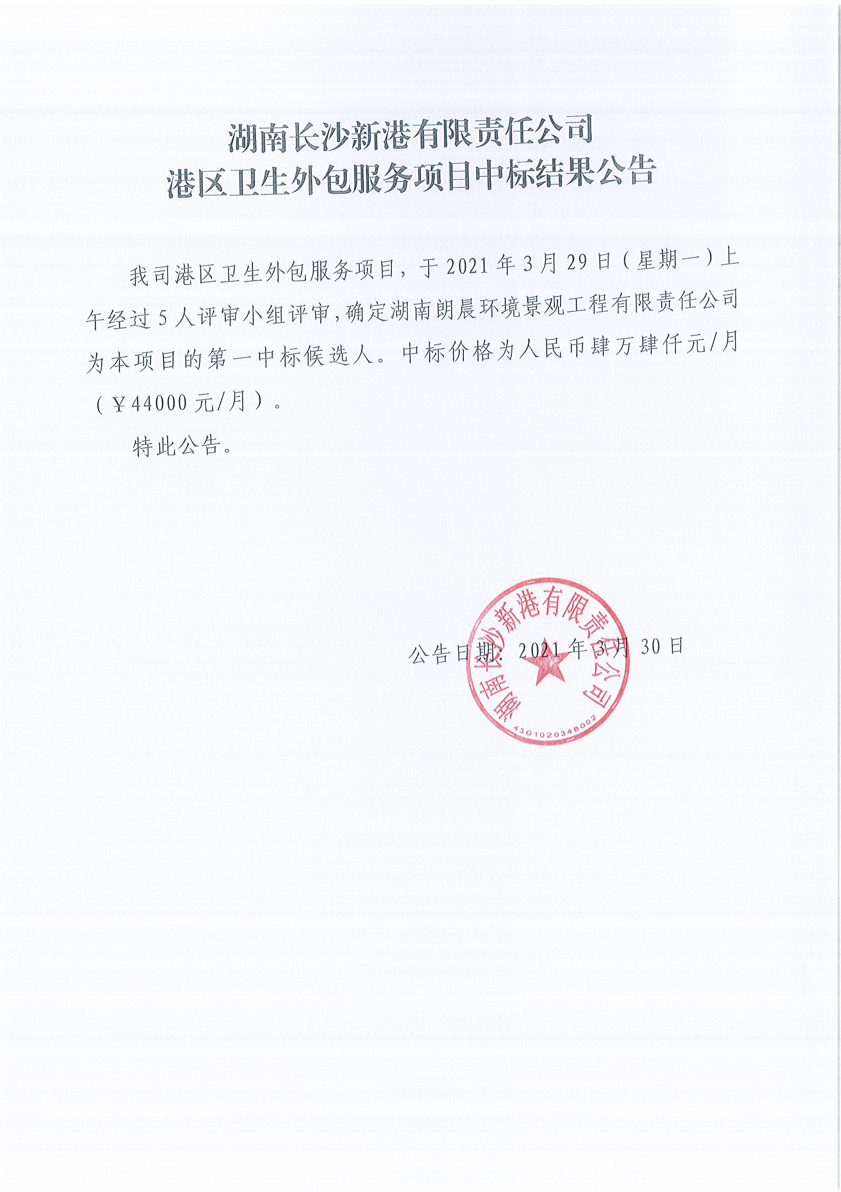 湖南長沙新港有限責任公司港區(qū)衛(wèi)生外包服務(wù)項目中標結(jié)果公告