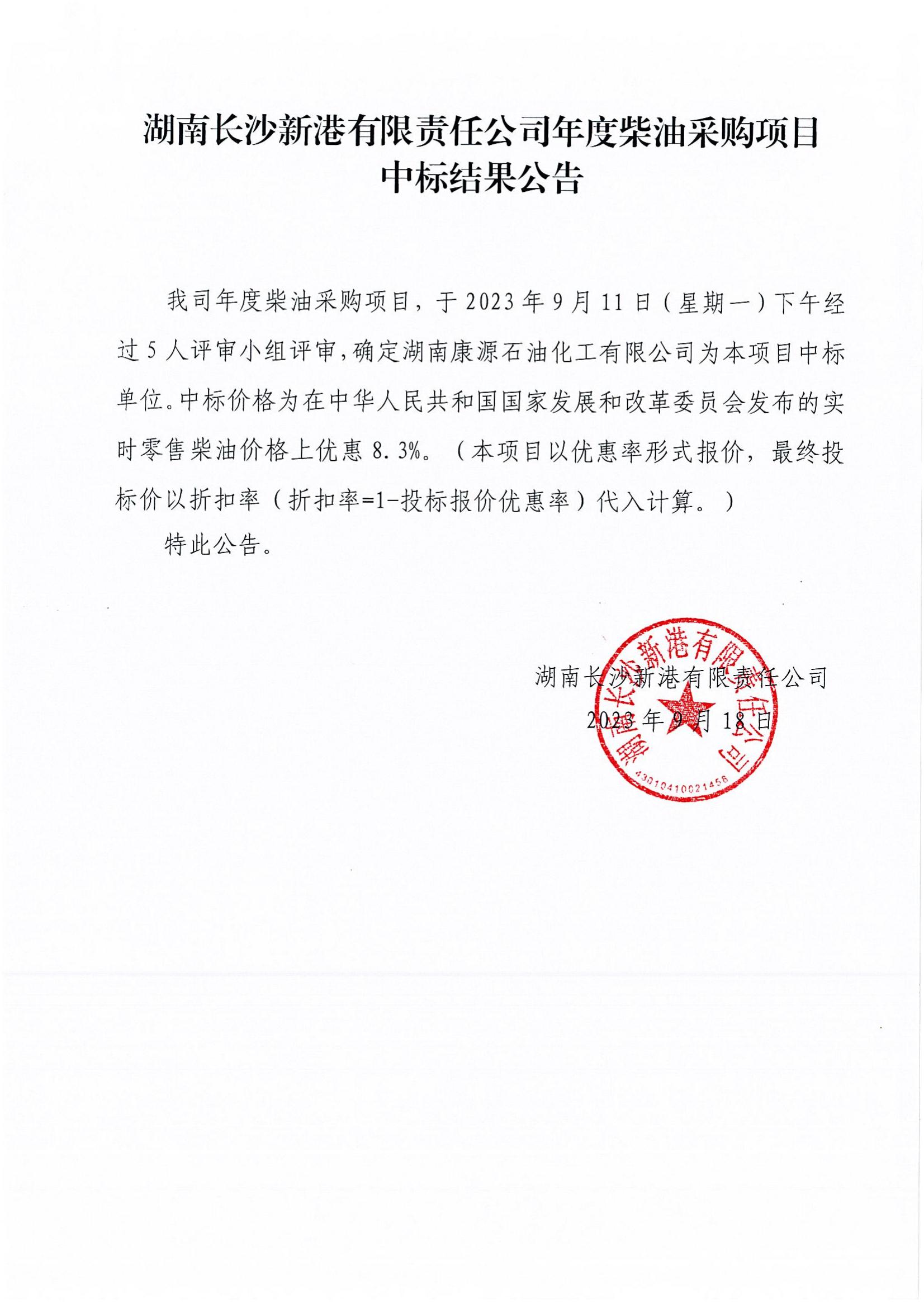 湖南長沙新港有限責(zé)任公司年度柴油項目中標結(jié)果公告